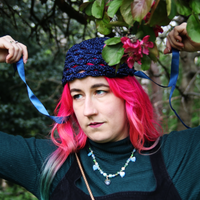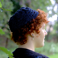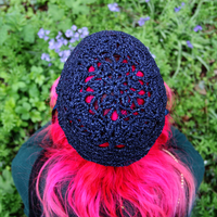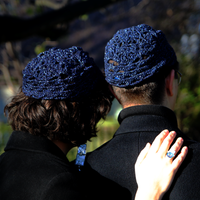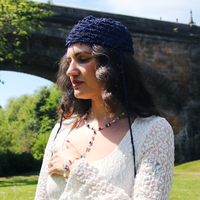 The Metallic Midnight Blue Cosmos Judith Cap is created with metallic blue and black yarn with the option of silk or braided adjustable ties. We offer the option to add Electric Blue Czech glass Icicle adornments weaved into the cap's scallop fringe , or if you wish to have custom pendants/adornments made for your cap or to incorporate pendants from the shop into your cap, please leave a note when checking out and we will follow up with available options.