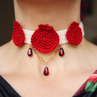 Introducing the regal Cascade Crochet Pomegranate Chokers; dancing on the line of opulence and comfort-wear with soft, pure cottton resting against the skin and precious handmade adornments cascading below.