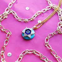 Vibrant hues and sea come together in this beautiful necklace. Featuring striking gold-plated and cubic zirconia pointed Magen David pendant mounted on azure shell and adorned with either sky blue or royal blue glass evil eye adornment. Both precious and protective, this sea-inspired treasure is a protective adornment for all seasons.