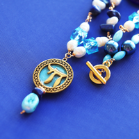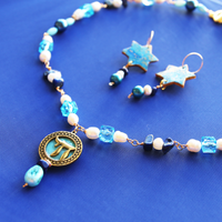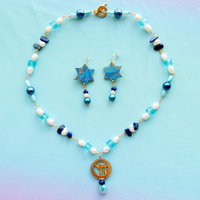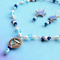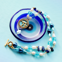 Introducing the ultimate Blue and White Am Yisrael Chai Judaica. This beautiful one of a kind hand-beaded gemstone and pearl Chai necklace features a gold lattice and turqoise shell cabachon pendant, lapis lazuli, salvaged glass and shell beads, and freshwater pearl. Handmade and hand-beaded meticulously with love to present a vision in sea and gold. Complete the look and match with our Gold Chai Beaded Charm Bracelet.