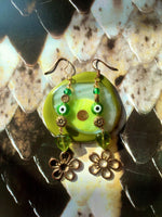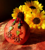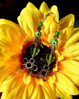 These lush handmade earrings feature a mix of salvaged and recycled vintage metals, beads, and vintage floral pendants restored to their former glory to create a garden of green and gold for the ears.