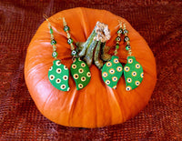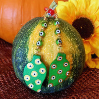These one of a kind upcycled creations feature restored vintage wooden pendants with hand-painted ayins and an assortment of vintage beads, sequins, and peridot. The pendants are suspended on a hand-made gold-plated hinge that allows them to sway playfully and make for delightful little stim accessories that are super fun to flick and play with (for anyone else who benefits from such features in their wearable art!)