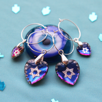 Iridescent Midnight Magen David Glass Heart Amulet Silver Hoop Earrings