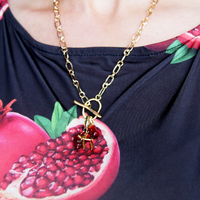 Toast the new year with a L'chaim with our Chai and Seven Species Charm Necklace. Front closure clasp necklace adorned with removable gold Chai, Kedem-inspired glass grapes, and handmade pomegranate seed charms.