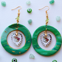 The beauty of the Lucky Lizard glass heart amulets have come together with our custom clay swirl pendants of the Green Ayins of Summer, to bring into creation a special one of a kind pair of statement earrings!