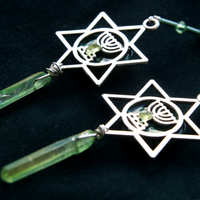 Summon abundance and opportunity with these powerful green gemstone judaica creations. Featuring vintage menorah magen david pendants combined with one of a kind handmade malachite cabachons adorned with vintage crystal, peridot, and green quartz, these beautiful one of a kind earrings will fill your life with verdant beauty.