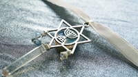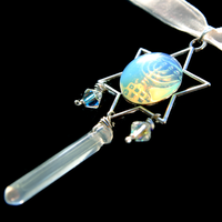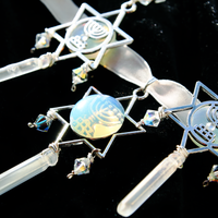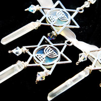 When mother nature brings on the snow storms, we bring on our protective wearable art to capture the beauty of winter without the cold. Featuring one of a kind reversible opaline magen david pendants adorned with recycled chandelier glass, quartz, and crystal for an ethereal one of a kind look. Wear as a single statement piece or together with the matching Opal and Ice Menorah Magen David Earrings as a powerful set!