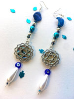 These stunning dangly statement earrings bring the sea and stars to life, cascading from the ears like a living aquatic sculpture. Hand-crafted with salvaged abalone pendants mounted with silver floral motif magens and featuring a carefully sourced assortment of sea-hued glass, crystal, shell, and freshwater pearl, these one of a kind earrings are the wearable judaica of underwater fairy tales come true.