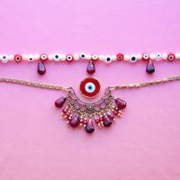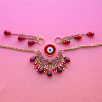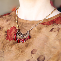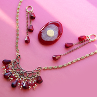 This one of a kind necklace is the end result of a truly special transformation - combining salvaged vintage components, hand-beading, and handmade pendants to create a one of a kind testament to the power and beauty of the pomegranate. Adorned with handmade pomegranate arils, crystal and gold-plated findings.