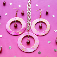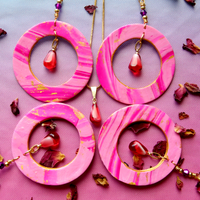 This collection's Pom de résistance are these Pomegranate Molasses Statement Earrings. Made with custom pink, white, and fuschia marbled clay with gold accents and adorned with beautiful glass pomegranate seeds, thick gold paperclip chain and vibrant crystal to really make these special earrings pop.