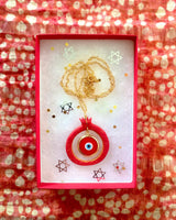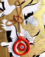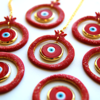 The luxurious Royal Pom'ayin'granate Pendant features a handmade red glass and gold evil eye, handmade clay frame finished with a custom in-house varnish embedded with glitter and gold, attached to a gold-plated chain. Complete the look and pair with our Royal Pom'ayin'granate Earrings.