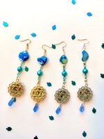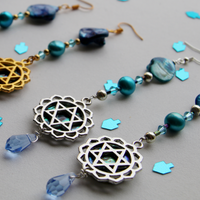 These stunning dangly statement earrings bring the sea and stars to life, cascading from the ears like a living aquatic sculpture. Hand-crafted with salvaged abalone pendants mounted with silver floral motif magens and featuring a carefully sourced assortment of sea-hued glass, crystal, shell, and freshwater pearl, these one of a kind earrings are the wearable judaica of underwater fairy tales come true.