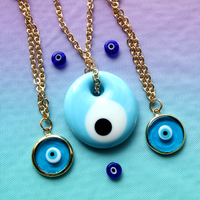 The glazed ceramic pendant is waterproof, however the gold chain will tarnish if exposed to water. If you wish to wear your sky blue ceramic ayin in the water simply transfer it to a water-safe cord or string necklace