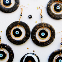 Adorn yourself in your very own piece of the night sky with these dreamy Judeofuturist designs. Hand-crafted from specially mixed, hand-painted and glazed clay, adorned with obsidian glass and gold ayins, and finished with vintage black crystal beads, these one of a kind lightweight earrings and necklaces will have you feeling like the brightest star in the sky. We always endeavor to make lightweight wearable statement art to avoid sensory issues and these earrings are no exception.