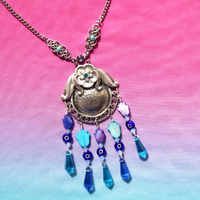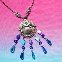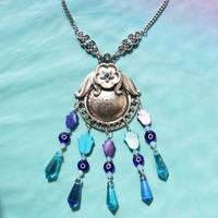 The vintage silver pendant is beautifully adorned with glass beads, hand-carved hamsa shells, and crystal, all in a spectacular arrangement of complementary blues. Building on the original vintage pendant, the inspiration behind this unique creation is the touch of mother nature herself, reflected in the many protective sea and sky coloured hamsas that dangle gracefully from inset original hardware. The necklace is finished on a perfectly paired resored vintage silver chain, with handmade filigree and crystal details.