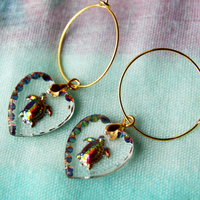 Tubular Turtle Iridescent Glass Heart Amulet Gold Hoop Earrings