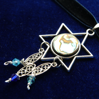 This one of a kind design inspired by the sea and featuring a gorgeous moon-like slice of abalone is the statement choker to end all statement chokers. Dripping with crystal accents adorning salvaged filigree, the unique reversible pendant design allows you to showcase the iridescent abalone side or a crystal-accented menorah magen with the subtle, earthy underside of the natural abalone shell underneath. Either way you choose to wear it, this one of a kind, show-stopping choker will have you turning heads whilst channeling the power of the sea.