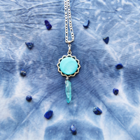 Pendant is 2.5 cm across. Full pendant length including quartz adornment is 6 cm
