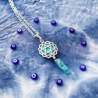 Treat yourself to two beautiful necklaces in one! This reversible Magen David design can be worn two ways, to either show off the magen david side of the pendant or the beautiful polished blue shell that looks like a beautiful flower. Adorned with blue quartz, this one of a kind reversible design allows you to wear your Judaica your way.