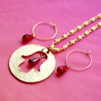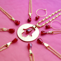 Abundance is the energy we're manifesting this shmita year and beyond, and nothing communicates abundance like the symbolic beauty of the pomegranate. Handmade glass pomegranate seed adorns a hammered gold-plated bronze hamsa pendant presented on gold plated chain to make a strong and simple solo accessory or a perfect layering piece. Complete the look and pair with our Shmita Glass Pomegranate Hoop Earrings.