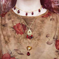 Nothing communicates abundance like the symbolic beauty of two of the seven species combined to create one beautiful wearable statement. The gold filigree pendant is designed to resemble the shape of a fig, adorned with gold beads and handmade cascading pomegranate seeds. This beautiful necklace can be worn as a striking solo piece, or layered with our other Abundace creations. Pair with our matching Filigree Fig Pom Seed Earrings to create a powerful set.
